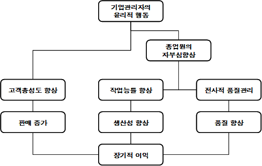 이종영과 요시하라(Lee&Yoshiara,1977)는 기업윤리 수준을 높이면 기업외부와 내부의 양 측면에서 영향을 미친다고 주장하였다. 이는 기업관리자의 윤리적 행동이 기업이미지 향상→ 고객의 충성도 향상→ 판매증가를 통하여 기업에게 장기적으로 이익을 창출한다는 순환과정과, 기업 관리자의 윤리적 행동이 종업원들의 회사에 대한 자부심을 제고시켜 작업능률 및 품질을 향상시킴으로서 궁극적으로 기업이익을 창출하게 된다는 또 다른 순환과정으로 설명하였다. 이에 관한 상세한 내용은 [그림2-1] 기업윤리 경영이익에 나타나 있다.