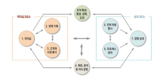 MB 경영품질 평가모델은 하버드 대학의 교수를 포함한 많은 전문가들이 도출해 낸 초일류 기업의 성공요인으로, 기업경영의 핵심을 7개 범주로 나누어 평가하는 시스템적 평가 모델이다. 7가지 범주는 리더십, 전략계획, 고객 및 시장 중시, 정보 및 분석, 인적자원 중시, 프로세스 관리, 사업성과로 구성되어 있는데, 이러한 범주들을 연결하고 통합하는 구조는 다음과 같다.