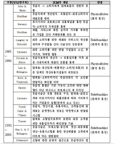 다시 말하자면, 공급사슬관리는 서비스되는 시장에 대한 대응성 및 효율성의 최적의 믹스를 달성하기 위해 공급사슬에 참여하는 자들 사이에 행하는 생산. 재고, 입지, 운송 등의 조정을 의미한다. 아래 표에 CM의 시기별, 특성별 SCM의 개념을 제시하였다.