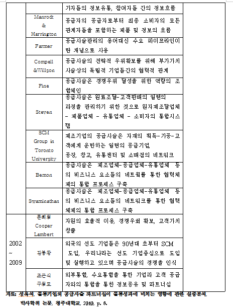 공급사슬관리(Supply Chain management)에 대한 정의는 여러 연구자에 의해 다양하게 정의 되어 지고 있으나 일반적으로 기업간의 파트너 쉽, 전략적 제휴 등을 바탕으로 통합 효율성을 추구하는 경영방식의로 통용되고 있다. 공급사슬관리는 고객서비스 수준을 만족시키면서 시스템 전반적인 비용을 최소화할 수 있도록 제품이 적절한 수량으로, 적절한 장소에, 적절한 시간에 생산과 유통이 가능하게 하기 위하여, 공급자, 제조업자, 창고ㆍ보관업자, 소매상들을 효율적으로 통합하는 데 이용되는 일련의 접근법이다. 또한 공급사슬관리는 기업이 관련을 맺고 있는 다른 외부기관들로 상호 공동으로 물류측면에서 고객에 대한 저비용과 고가치 서비스를 달성하고자 하는 것을 의미한다.